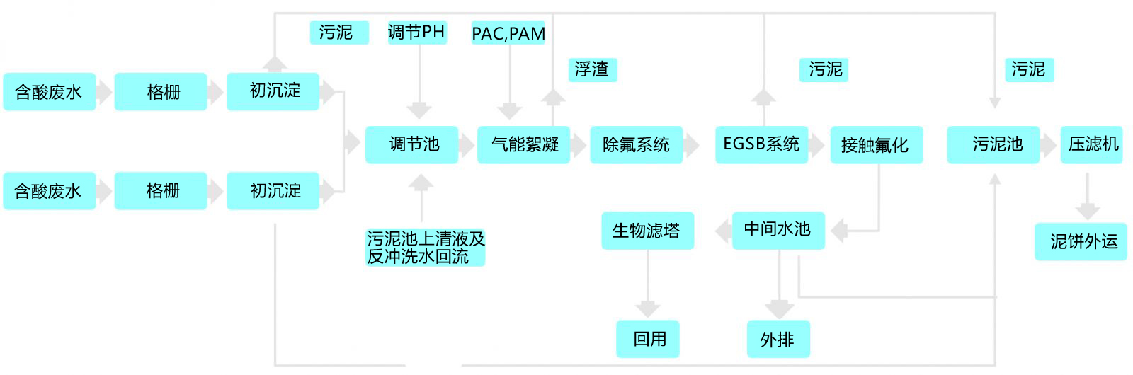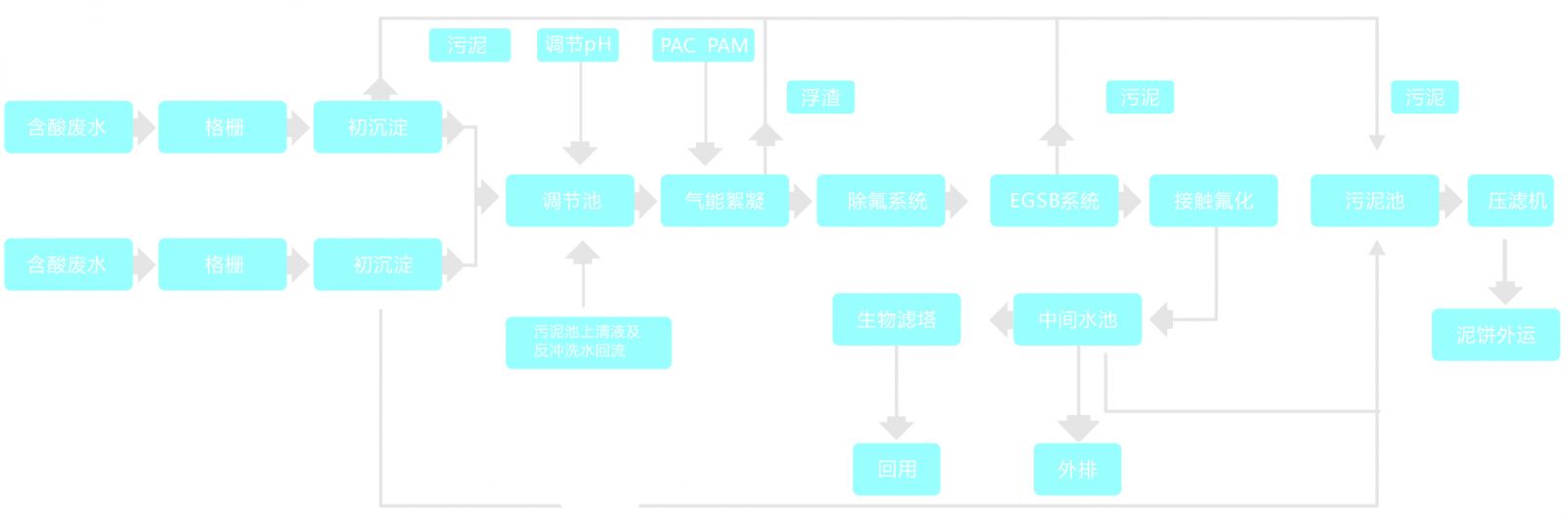 各生產車間外排廢水(酸水和堿水分流)由管網經格柵排渣后進入初沉池,靜沉去除大部分浮渣與大顆粒污染物后進入調節池,調節pH后提升至氣能絮凝池,投加絮凝劑進一步去除水中懸浮物,出水進入除氟裝置,通過投加專用活性吸附劑去除水中高濃度的氟化物。接著進入EGSB反應器進行生化處理,利用兼性及專性厭氧菌降解污水中COD,并將大分子有機物分解為小分子化合物以改善其可生化性,出水進入接觸氧化池,通過負載于填料上生物膜的作用,進一步去除水中COD等有機污染物,經由中間水池進行固液分離后上清液水質達標外排,或進入生物濾塔深度處理后回用。