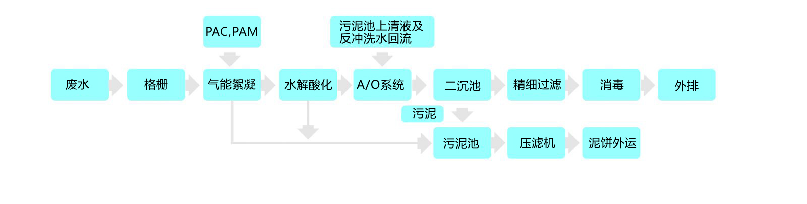 生產廢水經過格柵排至氣能絮凝系統,加入混凝藥劑,去除廢水中的色度和懸浮物后進入水解酸化池,將廢水中溶解性大分子有機物轉化為結構簡單的小分子物質,提高廢水可生化性,出水接著進入A/O系統,通過缺氧/好氧工段高效去除COD并實現脫硝,經二沉池進行固液分離,上清液經精細過濾、消毒后達標外排。